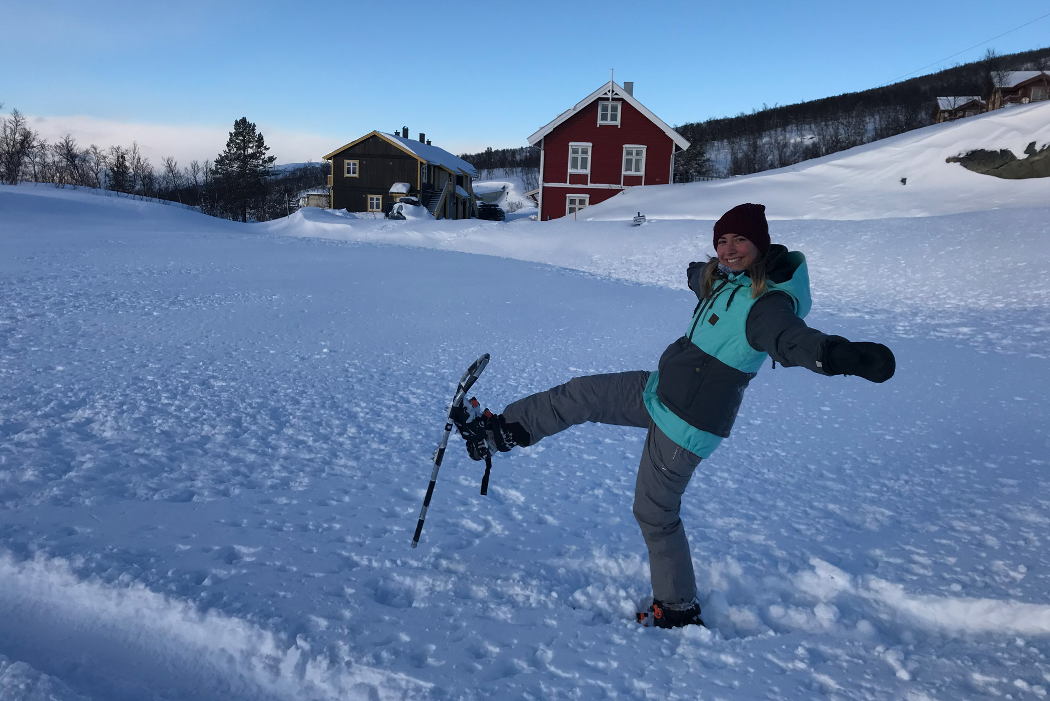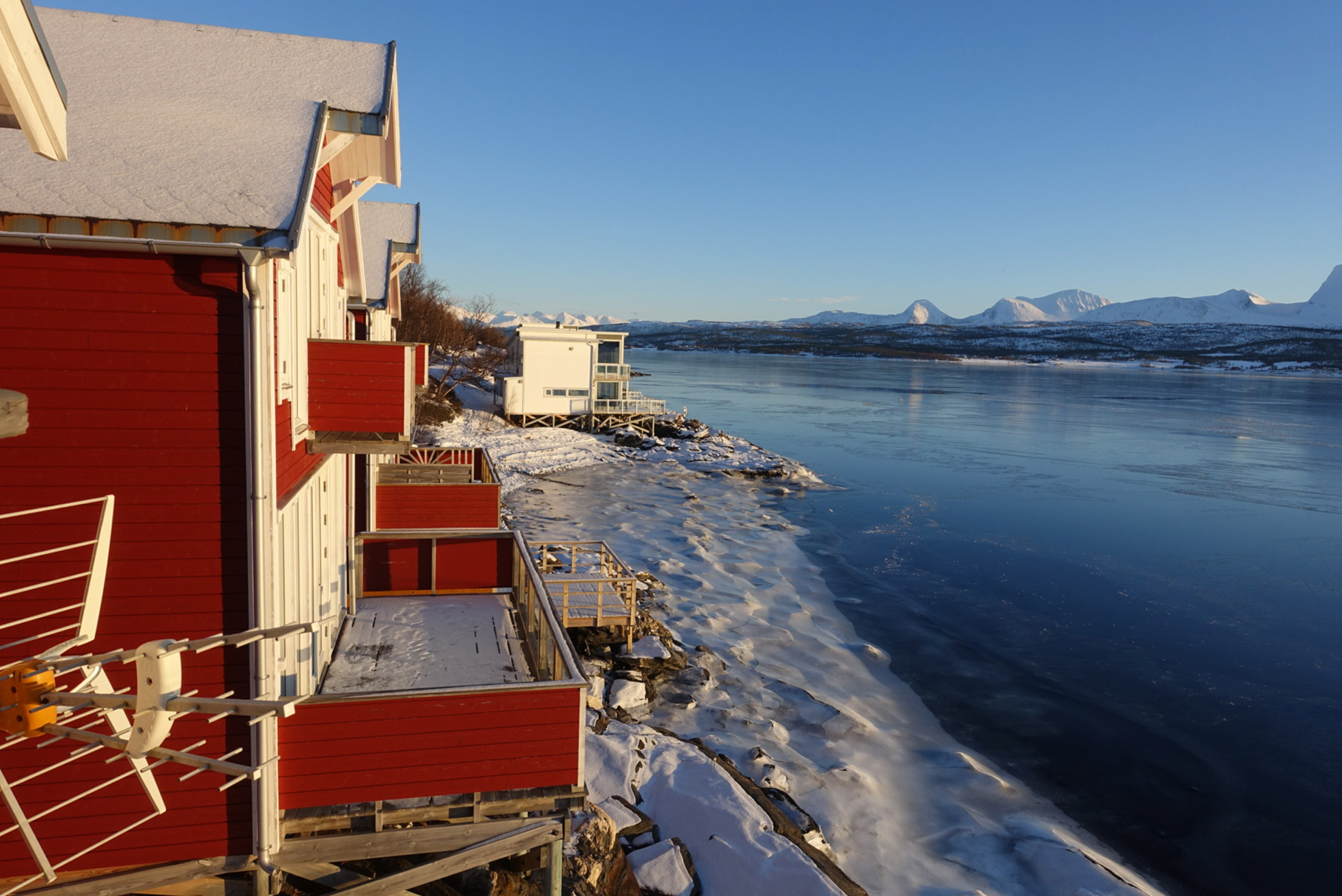 Ebenfalls unbezahlbar und wunderschön ist die Aussicht von den kleinen Ferienhäusern direkt am Fjord im Malangen Resort. Hier den Sonnenuntergang im eigenen kleinen Rorbu zu beobachten ist einmalig. Diverse Winteraktivitäten können von hier aus gestartet werden. Wir hatten eine Schneeschuhtour auf dem Programm und hörten schon bald das Knirschen unter unseren Riesenlatschen. Nordlichter gab es an diesem Abend leider keine zu sehen, doch war für uns trotzdem ein gelungener Abend.