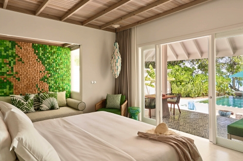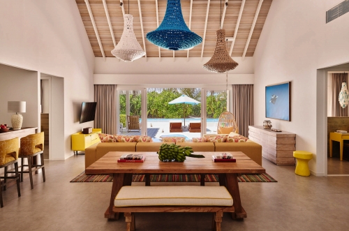 41 trendige Lagoon Villen (145 m2) sind auf Stelzen über Wasser gebaut und verfügen über ein geschlossenes Badezimmer mit Dusche und Badewanne sowie eine Aussendusche, Fön, Klimaanlage, Deckenventilator, Safe, Minibar, Weinkühlschrank, TV und eine möblierte, teilweise überdachte Terrasse mit Aussendusche und direktem Einstieg ins Meer. 41 Ocean Pool Villen (180 m2) Sonnenuntergangsseite, entlang des Hausriffes und mit Pool auf der Terrasse. 7 2 Bedroom Water Villen Pool (460 m2) am Anfang des Steges, mit zwei Schlaf- und Badezimmer, gemeinsamen Wohnbereich inkl. Bar und eine grosse Terrasse mit Pool. Zwei Rockstar 2 Bedroom Ocean Pool Villen (460 m2) am Ende des Steges, mit noch exklusiverem Dekor und mit eigenem Buggy. 8 Beach Villen (205 m2) direkt am Strand, Sonnenaufgangsseite, gleiche Ausstattung wie die Lagoon Villen, jedoch mit halboffenem Badezimmer. 8 Beach Pool Villen (205 m2) mit Pool auf der Terrasse. 16 Private Pool Villen (205 m2) Sonnenuntergangsseite, leicht zurückversetzt vom Meer mit sehr viel Privatsphäre. Je nach Lage ist der Strand sehr schmal und nicht ideal zum Baden. 2 2 Bedroom Beach Pool Villen (530 m2) Sonnenuntergangsseite, direkt am Strand und mit zwei Schlaf- und Badezimmer inkl. gemeinsamen Wohnbereich und Terrasse mit Pool.