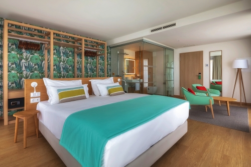 Greenest Hotel of Portugal, Natürliche, nachhaltige Materialien in den Zimmern, Intelligentes Klimamanagement: Automatische Ausschaltung der Klimaanlage, sobald die Fenster geöffnet werden; Herunterfahren des Systems, wenn die Zimmer leer sind, Restaurants kochen mit saisonalen, lokalen Bio-Produkten, Bewässerung des Gartens mit Bergwasser, Solarenergie beheizte Pool